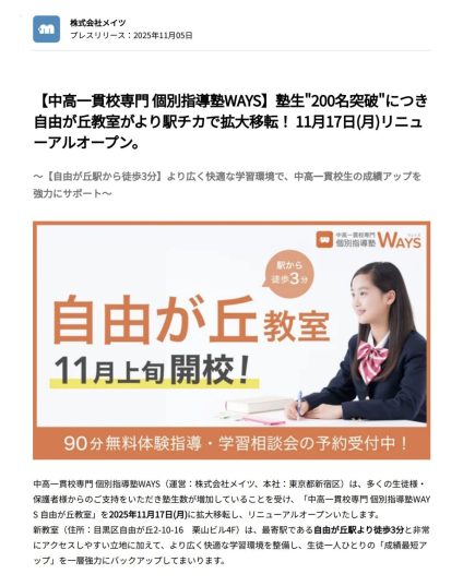 【中高一貫校専門 個別指導塾WAYS】塾生”200名突破”につき自由が丘教室がより駅チカで拡大移転! 11月17日(月)リニューアルオープン。
