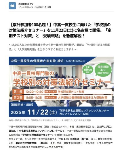 学校別の対策法紹介セミナー(名古屋)の詳細については、下記プレスリリースをご覧ください▼
