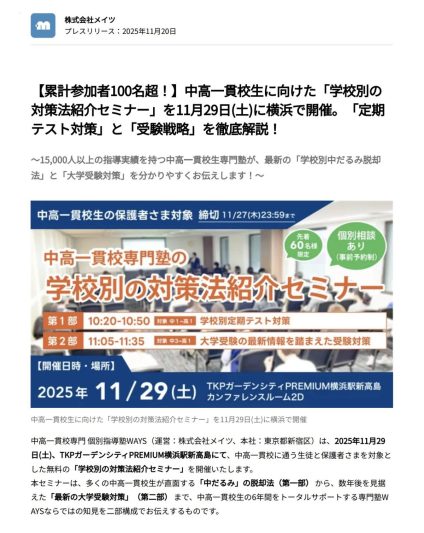 学校別の対策法紹介セミナー(横浜)の詳細については、下記プレスリリースをご覧ください▼